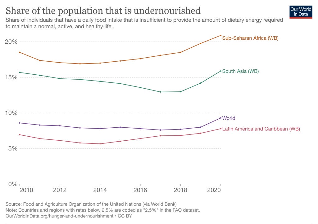 The economy: Most of the world is now recovering economically from the pandemic. And while there will certainly be more shocks, I assume that aggregate economic growth will remain the norm for the foreseeable future. The question is whether that growth will benefit people who are currently struggling to access adequate food. But it seems plausible to expect that economic trends will continue to be broadly consistent with those that existed while hunger was declining from the 1970s onward.
